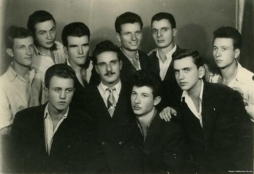 Одењето кај професионален фотограф за да се овековечи другарството меѓу кочанските еснафи некогаш беше посебен „ритуал“ за кој претходно се одеше на бербер и се одбираше најубавиот костум или кошула - од лево на десно (горе) Кирил Апостолов - Кирчо Заболекаро, Петар Глигоров - Заботехничаро, Драги, Михаил Димитров - Михо и Киро Црвчето, (долу) Киро Арсов - Учитело, Здравко Зебец, Јован Стојанов - Ване Пиштоло, Љупчо Клисаро и Љупчо Малчо - 19.09.1954.