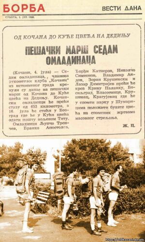(Кочани, 4. јули) - Седум младинци, членови на ракометниот клуб „Кочани“ од истоимениот град тргнаа денеска на пешачки марш од Кочани до Куќата на цвеќето на Дедиње. Кочанските младинци ќе поминат патека од 653 километри, а на 16. јули ќе стигнат во Белград, каде во Куќата на цвеќето ќе му оддадат почит на саканиот Тито. Младинците Љупчо Тренчев, Бранко Апостолов, Ѓорѓи Катмеров, Николчо Симеонов, Владимир Андов, Зоран Кушевски и Лазар Димитријев ќе поминат низ Крива Паланка, Босилград, Власотинце, Крушевац, Крагуевац каде во спомен паркот во Шумарице ќе положат букети цвеќе на споменикот на жртвите на масовното стрелање. Ж.Ц. (напис во весникот Борба, 5. јули 1980 г.)