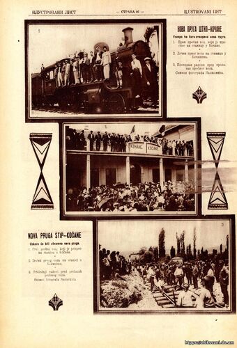 Кратка информација со текст и фотографии за доаѓањето на првиот воз во Кочани објавена во списанието „Илустровани лист“ што се издавало во Белград. Во објаснувањето на фотографиите пишува: НОВА ПРУГА ШТИП - КОЧАНИ 1. Првиот пробен воз кој пристигна во станицата во Кочани 2. Дочек на првиот воз во станицата во Кочани 3. Завршни работи пред тргнувањето на пробниот воз Снимки на фотографот Надашкиќ. - 1926 г.