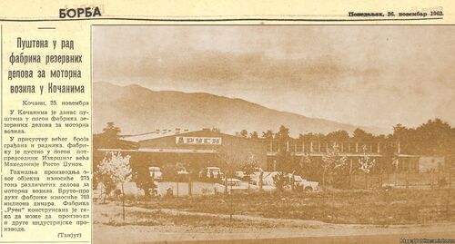 Кочани, 25. ноември Во Кочани денеска е пуштена во погон фабрика за резервни делови за моторни возила. Во присуство на поголем број граѓани и работници, фабриката ја пушти во погон потпретседателот на Извршниот совет на Македонија Ристо Џунов. Годишното производство на овој објект ќе изнесува 275 тони различни делови за моторни возила. Бруто производот на фабриката ќе изнесува 703 милиони динари. Фабриката “Руен“ е конструирана така што ќе може да произведува и други индустриски производи. (Танјуг)